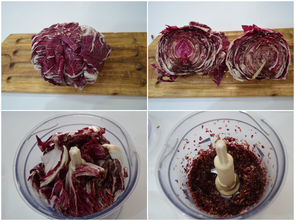 Pulite il radicchio, lavatelo e sminuzzatelo in un mixer per pochi secondi (dev'essere tritato, non ridotto in poltiglia).