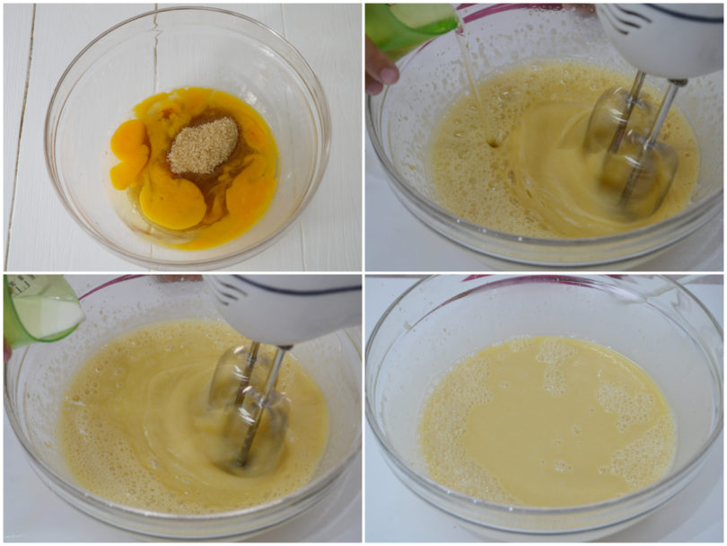 Montate le uova con lo zucchero fino ad ottenere un composto chiaro e spumoso.