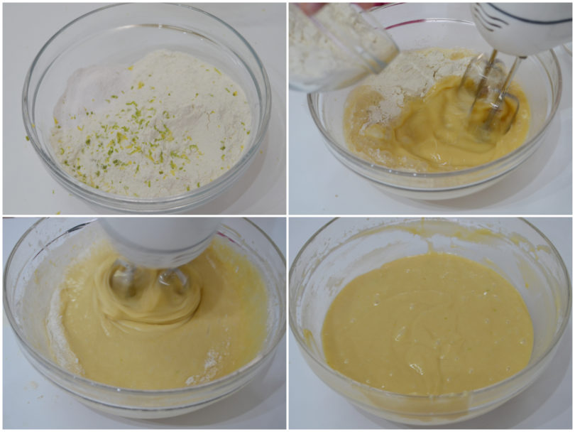 Setacciate farina e lievito in una ciotola, unite anche la buccia di lime, quindi incorporateli al composto di uova.