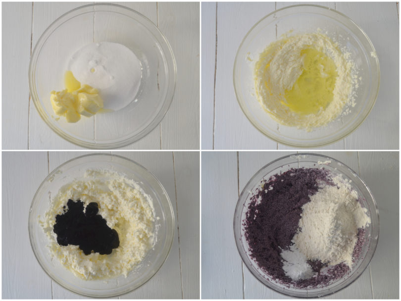 Lavorate il burro con lo zucchero fino ad ottenere una crema, quindi unite prima gli albumi e poi le more frullate e amalgamate.