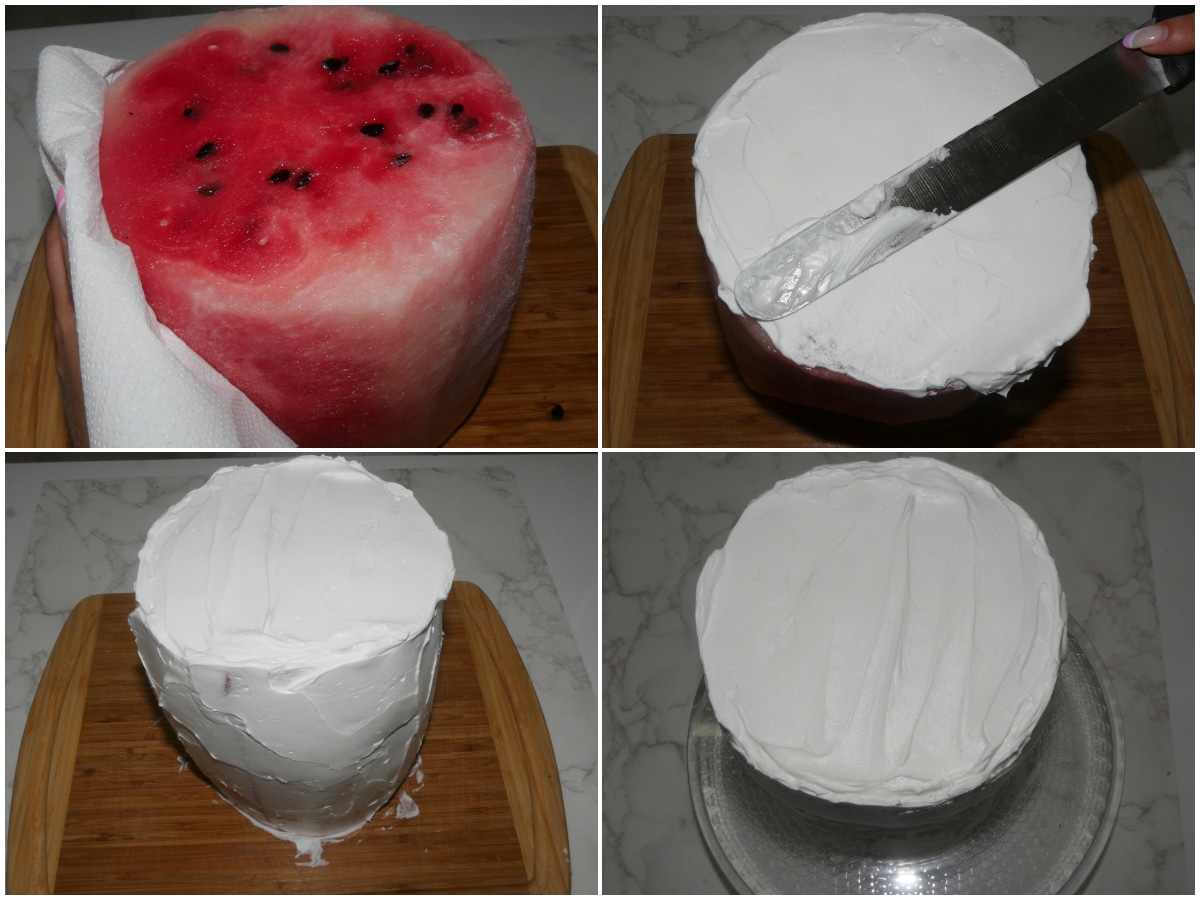 Ricoprite completamente l'anguria con la panna, come se steste glassando una torta, livellando bene la superficie con una spatola.
