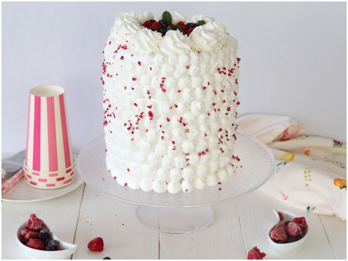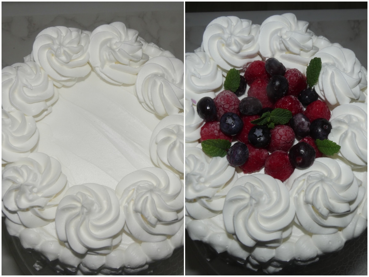 Decorate la superficie con una corona di panna e posizionate al centro frutti di bosco e foglioline di menta.