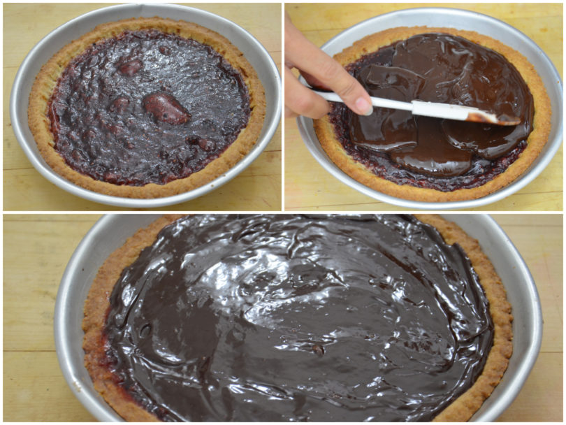 Una volta che la ganache è tiepida, versaTela sulla crostata ai lamponi, quindi mettetela in frigo e fate riposare la torta per un'ora.