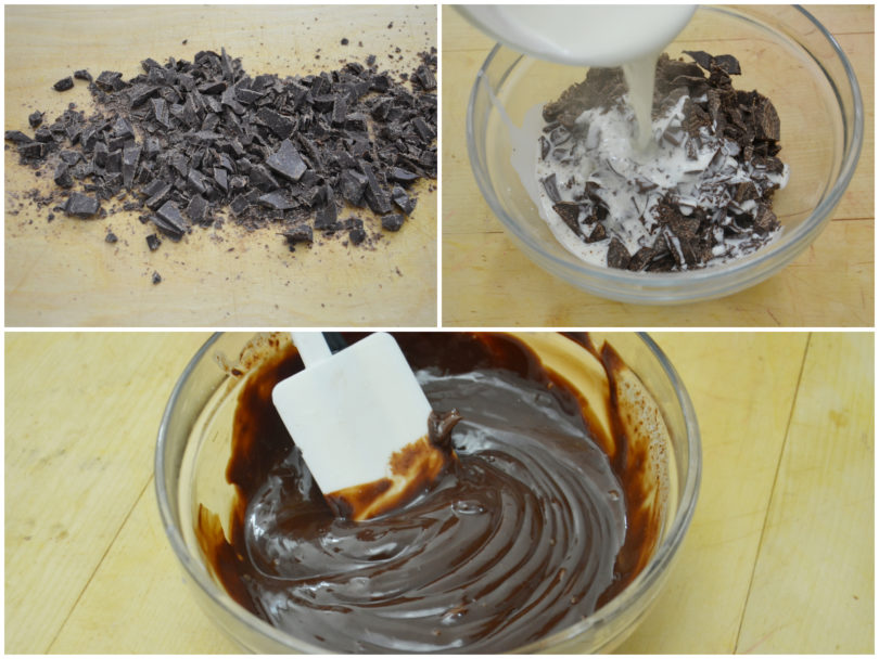 Tagliate finemente il cioccolato e mettetelo in una ciotola, versate al suo interno la panna bollente e mescolate fino ad ottenere una crema liscia ed omogenea.