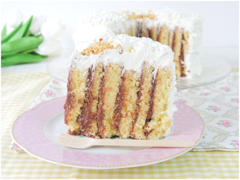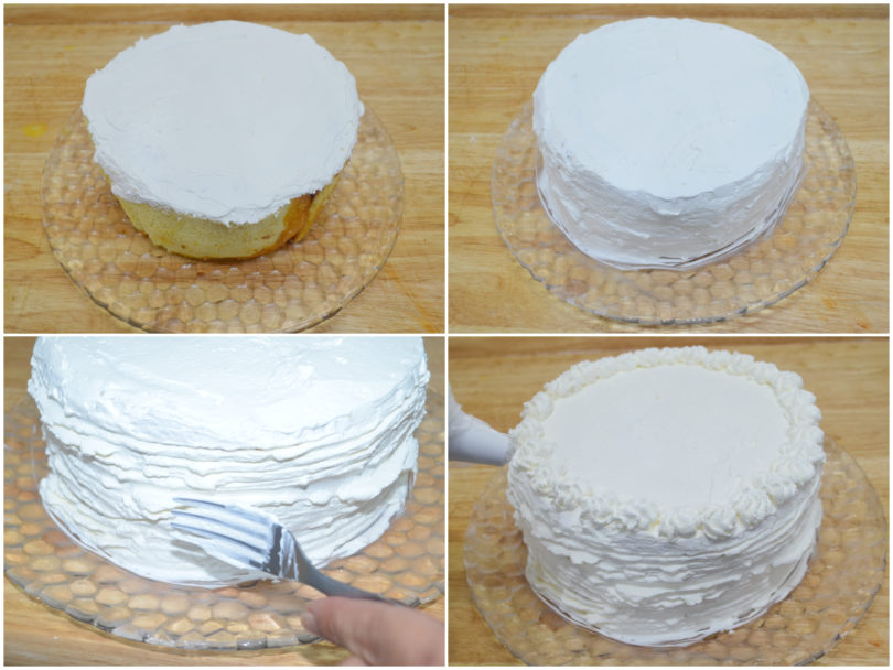 Infine montate la panna ben fredda di frigo, riprendete la torta e ricopritela con la panna decorandola a piacere.