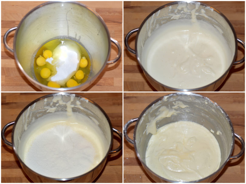 Preparate la crema: lavorate i tuorli con lo zucchero, poi incorporate farina e cacao setacciati (unite qualche cucchiaio di latte se serve), poi incorporate anche il latte riscaldato.
