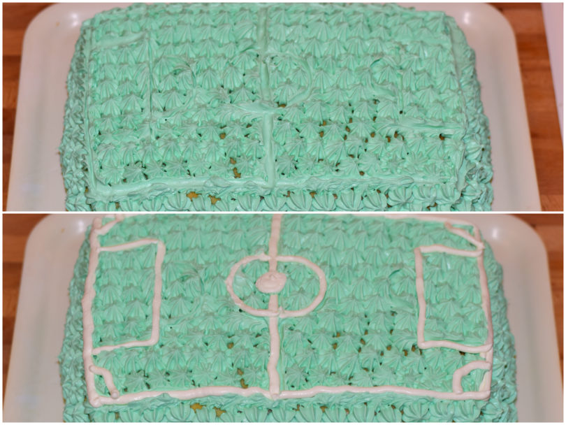 Poi mettete il frosting bianco in una sac-à-poche pulita con beccuccio liscio e sottile e create le linee del campo.