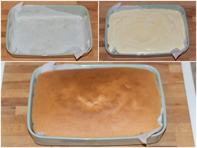 Innanzitutto preparate il pan di Spagna: montate le uova con zucchero e vaniglia finché non triplicheranno di volume (almeno 10 minuti), poi incorporate la farina setacciata e mescolate molto delicatamente dal basso verso l'alto, in modo da non far smontare le uova.