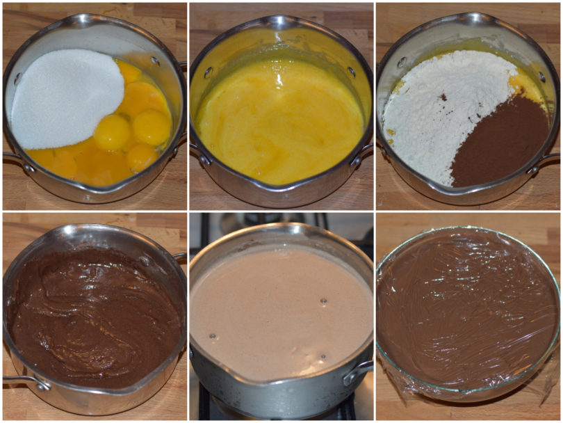Trasferite in un pentolino e cuocete a fiamma bassa per farla addensare, mescolando costantemente, poi spostate in un contenitore freddo, coprite con pellicola per alimenti a contatto e lasciare raffreddare.