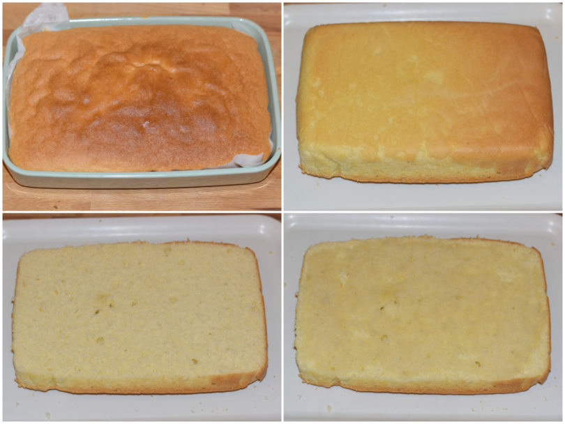 Riprendete il pan di Spagna, tagliatelo a metà in orizzontale, disponete la base su di un vassoio o un piatto da portata e bagnatelo con lo sciroppo.