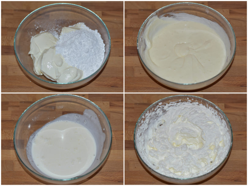 Preparate il frosting mescolando prima il formaggio con lo zucchero e poi incorporando la panna montata mescolando con movimenti delicati, dal basso verso l'alto.
