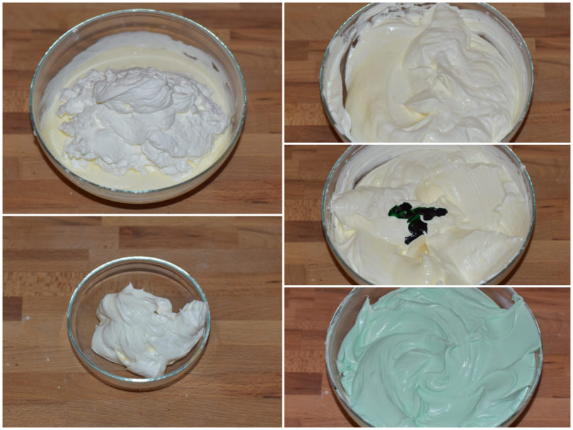 Tenete da parte qualche cucchiaio di frosting bianco, e nel resto aggiungete il colorante.