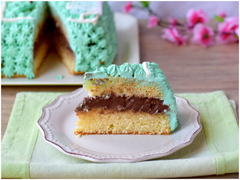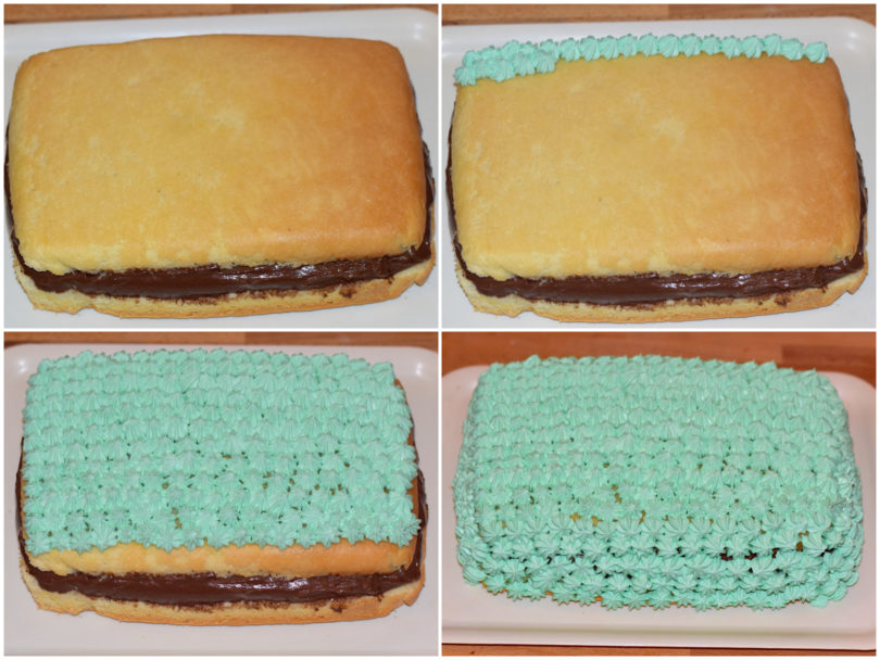 Trasferite il frosting verde in una sac-à-poche dal beccucchio a stella non troppo grande e create dei ciuffetti su tutta la superficie della torta per creare il prato.