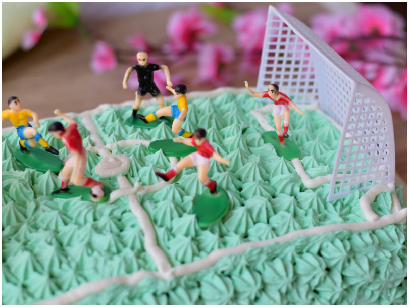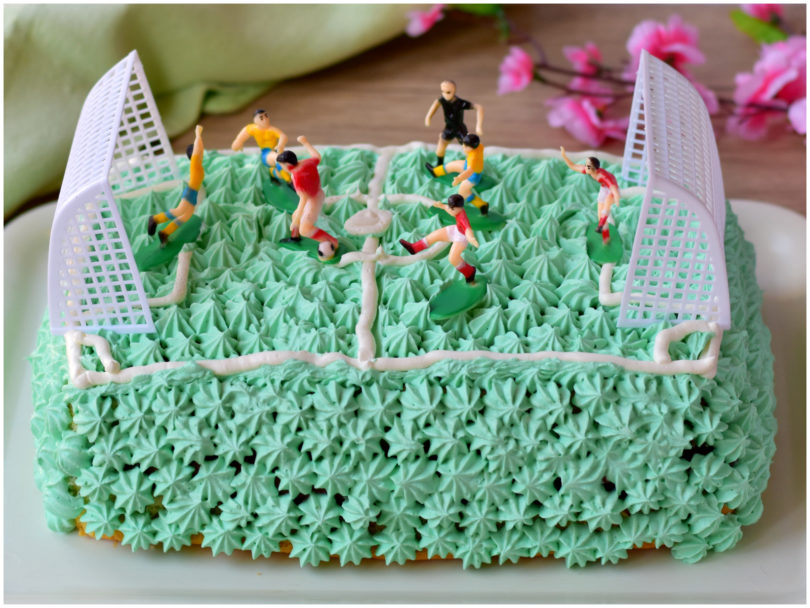 La torta campo di calcio è pronta, non vi resta che aggiungere porte e giocatori e servire.