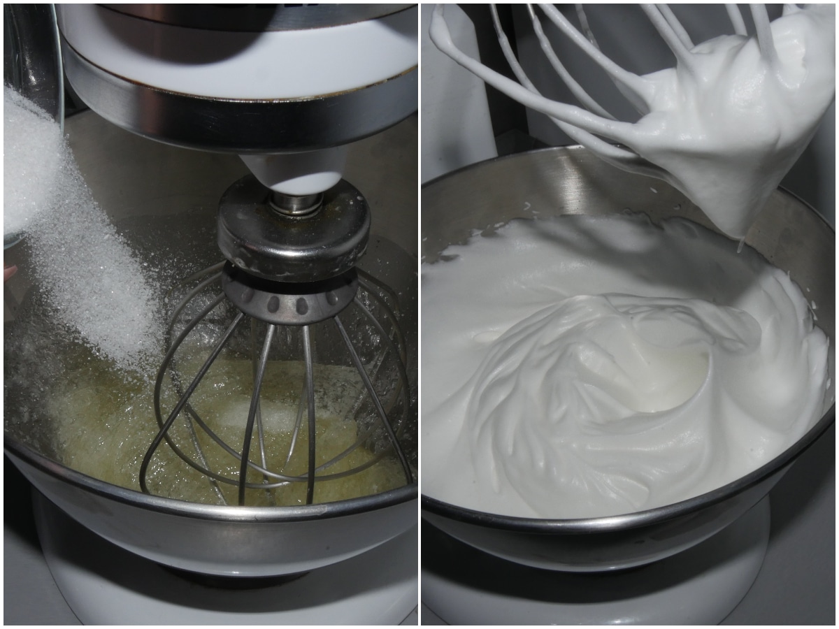 A parte, montate gli albumi, aggiungendo lo zucchero a filo, fino ad ottenere una meringa lucida.