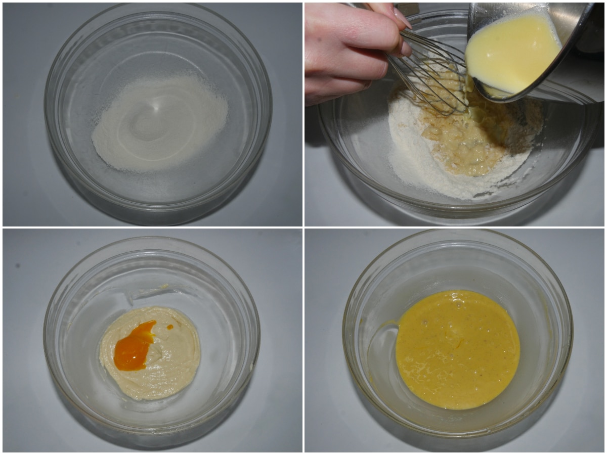 Setacciate la farina in una ciotola e aggiungeteci il composto di latte e burro a filo, mescolando con una frusta, quindi unite anche i tuorli, 1 per volta, sempre mescolando, e infine anche la vaniglia.
