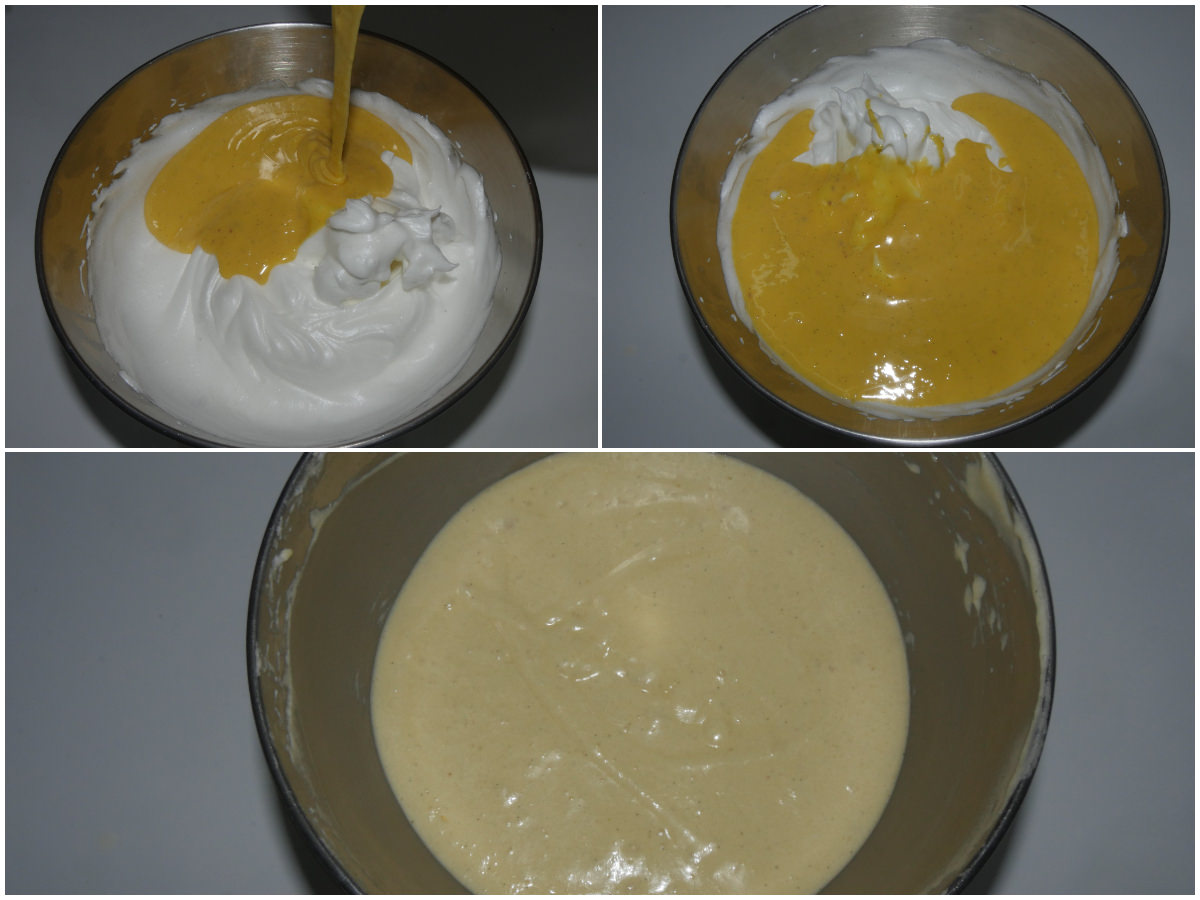 Incorporate il composto con i tuorli agli albumi, mescolando delicatamente con movimenti dal basso verso l'alto, per non far smontare gli albumi.