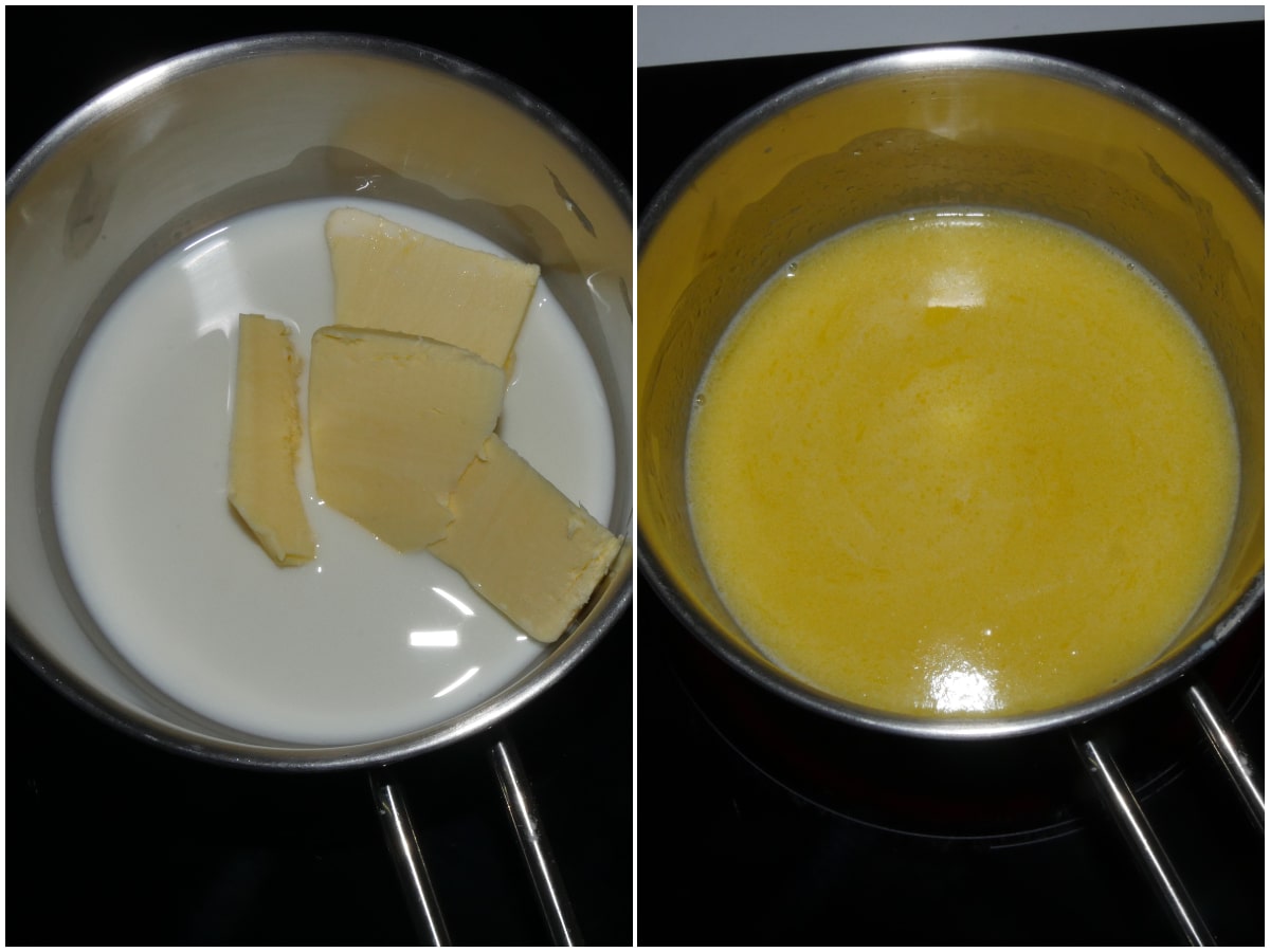 Mettete latte e burro in un pentolino, fate sciogliere il burro e fate scaldare il tutto senza arrivare a bollore (deve essere caldo ma non tanto da non poterci infilare un dito: se avete un termometro per dolci, portatelo a 50°C).