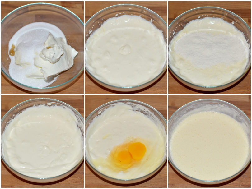Innanzitutto preparate la crema al formaggio per la parte cheesecake: unite in una ciotola formaggio, zucchero e vaniglia, quindi incorporate prima la farina setacciata e poi anche le uova.