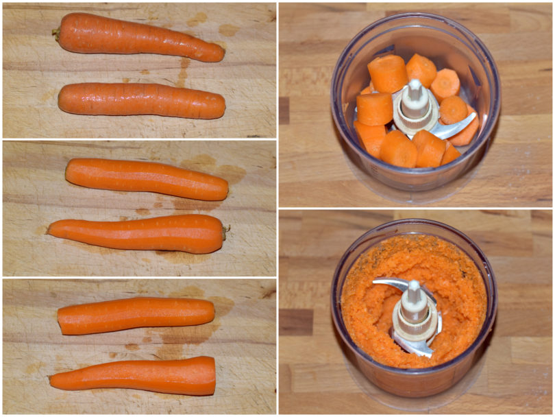 Mettete da parte il primo impasto e dedicatevi al secondo: mondate le carote, tagliatele a pezzi e frullatele finemente con un mixer.