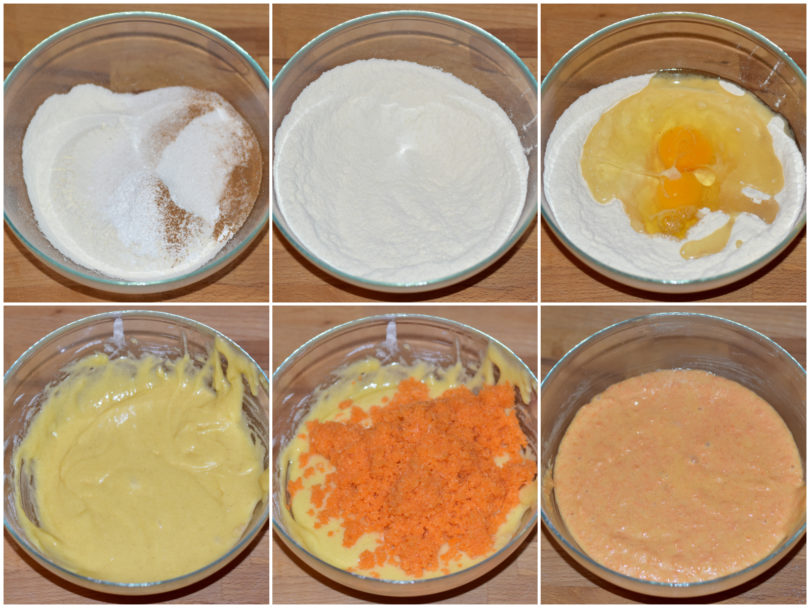 Unite in una ciotola tutte le polveri (farina e lievito setacciati, bicarbonato, zucchero, cannella e noce moscata), poi incorporate prima uova e olio e infine anche le carote.