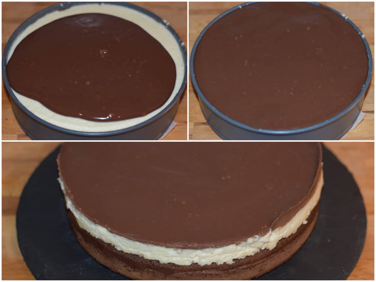 Riprendete lo stampo, versateci sopra la ganache, distribuendola in maniera uniforme, quindi lasciate riposare in frigo per almeno 2 ore prima di staccarla delicatamente dai bordi ed eliminare il cerchio dello stampo a cerniera.