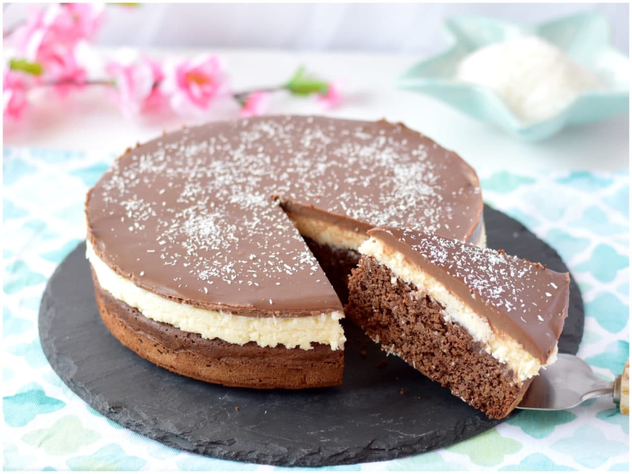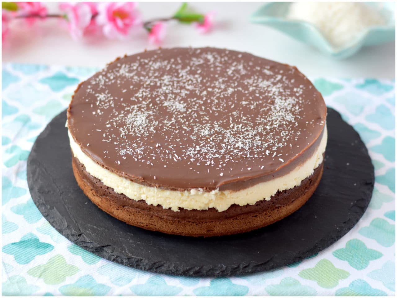 La torta cocco e cioccolato è pronta, non vi resta che decorarla con una spolverata di cocco rapè e servirla.