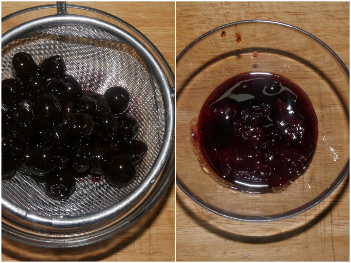 Scolate le amarene dallo sciroppo, tenendolo a parte e unendoci poi (allo sciroppo) la marmellata.