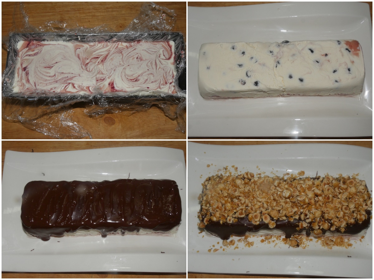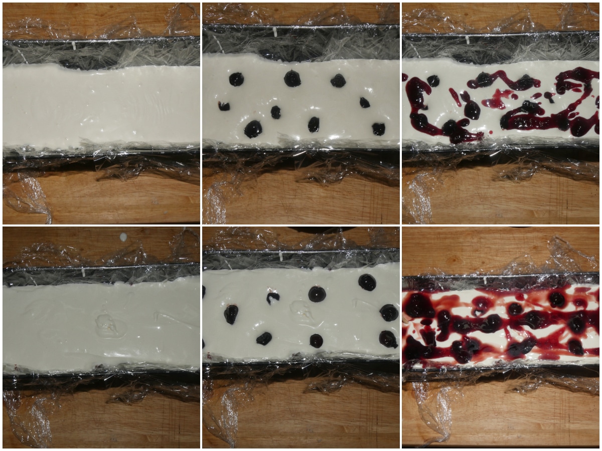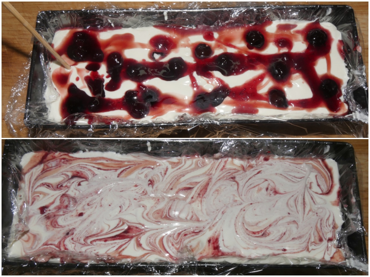 Con uno spiedino, create dei movimenti circolari per variegare il gelato, quindi coprite con la pellicola e lasciate in freezer per almeno 8-10 ore.