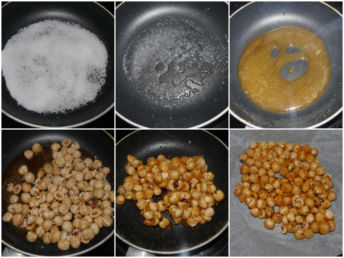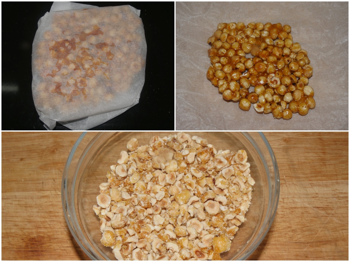 Preparate il croccante: fate sciogliere lo zucchero in una padella antiaderente a fiamma bassa, lasciate che inizi a caramellare e quando sarà bello dorato aggiungete le nocciole e mescolate, quindi trasferite su di un foglio di carte forno, coprite con altra carta forno, appiattite fino a create uno strato più o meno uniforme e lasciate raffreddare.