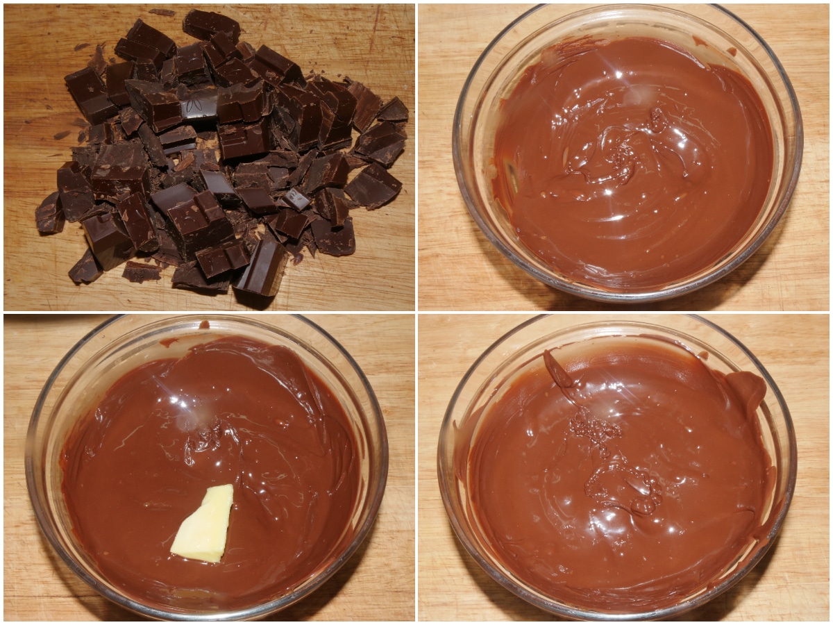 Spezzettate il cioccolato e scioglietelo (in microonde o a bagnomaria), quindi aggiungete il burro e mescolate fino a farlo sciogliere in maniera uniforme.