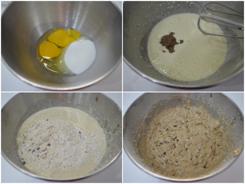Unite prima la crema di castagne e poi farine e lievito setacciati e le gocce di cioccolato e amalgamate bene.