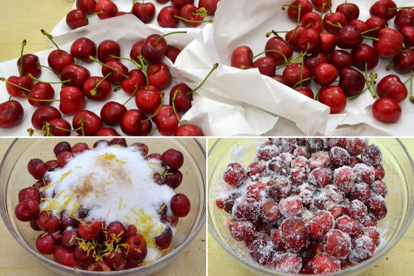 Innanzitutto lavate le ciliegie, asciugatele, denocciolatele, mettetele in una ciotola con i 2 cucchiai di zucchero e buccia e succo di limone e lasciatele da parte.