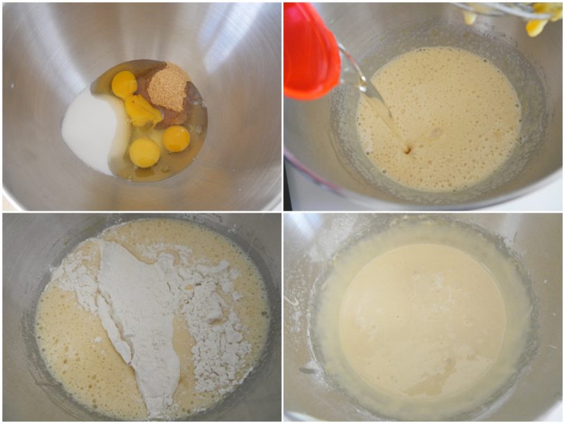 Nel frattempo che le ciliegie si insaporiscono, montate le uova con lo zucchero bianco e lo zucchero di canna, quindi unite prima l'olio e poi la farina setacciata con il lievito.