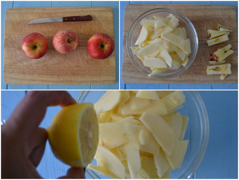 Innanzitutto pulite le mele, tagliatele a fettine sottili e irroratele con il succo di limone.