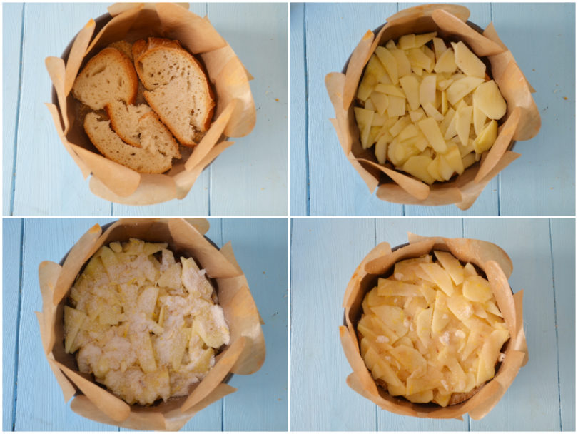 Procedete quindi con un secondo strato di pane, mele e zucchero (se vi avanzano ingredienti potete procedere anche con un terzo strato, basta che finiate ad almeno 1 cm dal bordo della teglia).