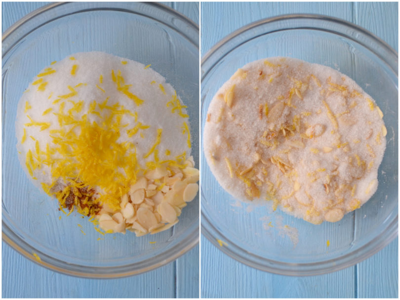 Unite in una ciotola, unite zucchero, mandorle, cannella e buccia di limone e mescolate.