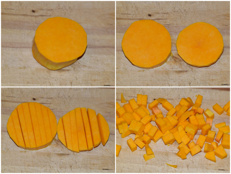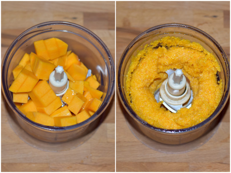 Tagliate la zucca in cubetti piccolini e frullatela con un mixer insieme con l'olio di semi.