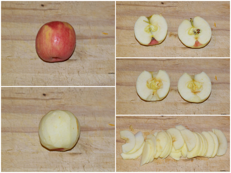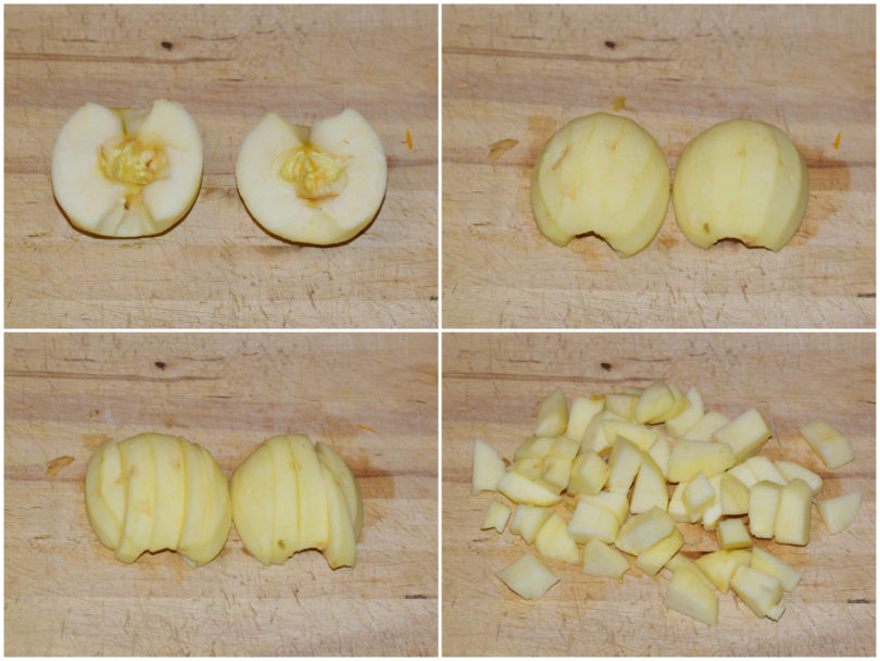 Mondate le mele e tagliatene metà a fettine sottili, l'altra metà a cubettini.