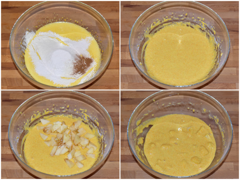 Incorporate al composto di uova prima le polveri (farina, lievito e cannella) setacciate, poi le mele a cubetti.