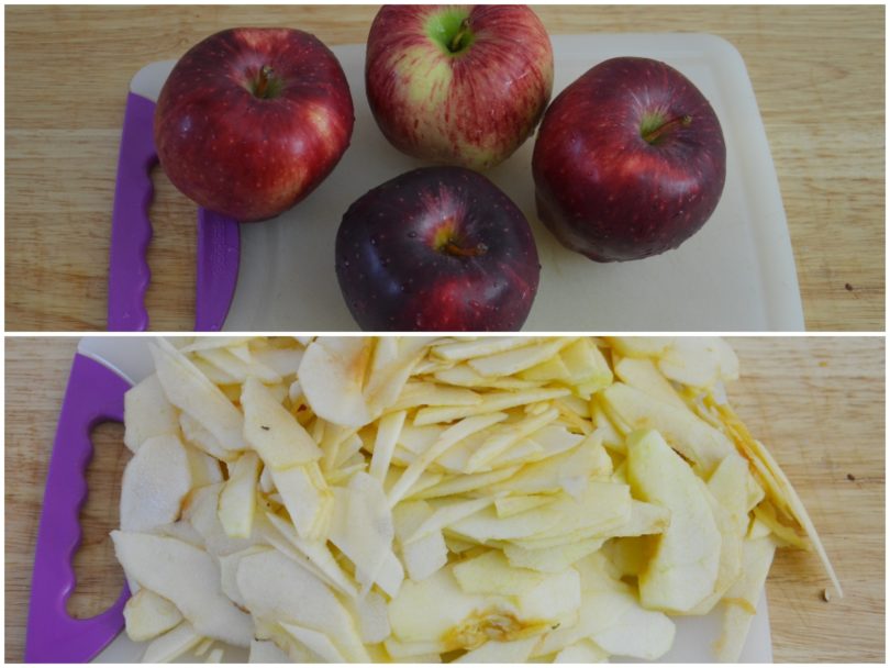 Lavate le mele, sbucciatele e tagliatele prima in 4 parti, eliminando il torsolo, e poi a fettine molto sottili.