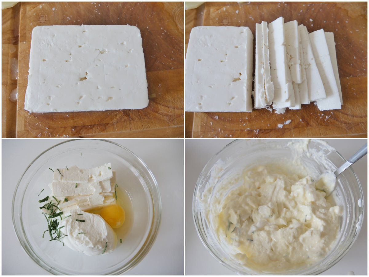 Nel frattempo preparate la crema: tagliate la feta a fettine sottili e poi a pezzi, quindi schiacciatela con la forchetta e amalgamatela con lo yogurt, l'uovo e l'erba cipollina tritate.