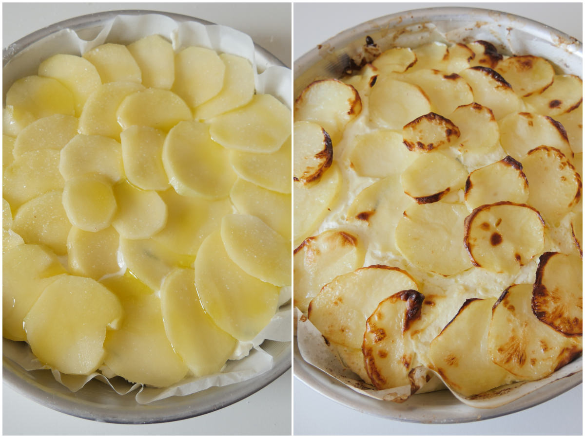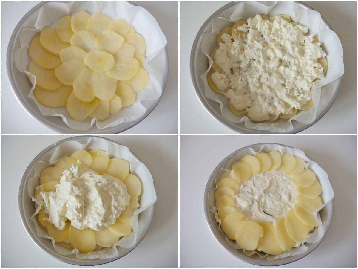 Foderate lo stampo con carta forno, quindi create una base con le fettine di patate, sovrapponendole leggermente tra loro, in modo da creare una superficie uniforme, e salate leggermente.
