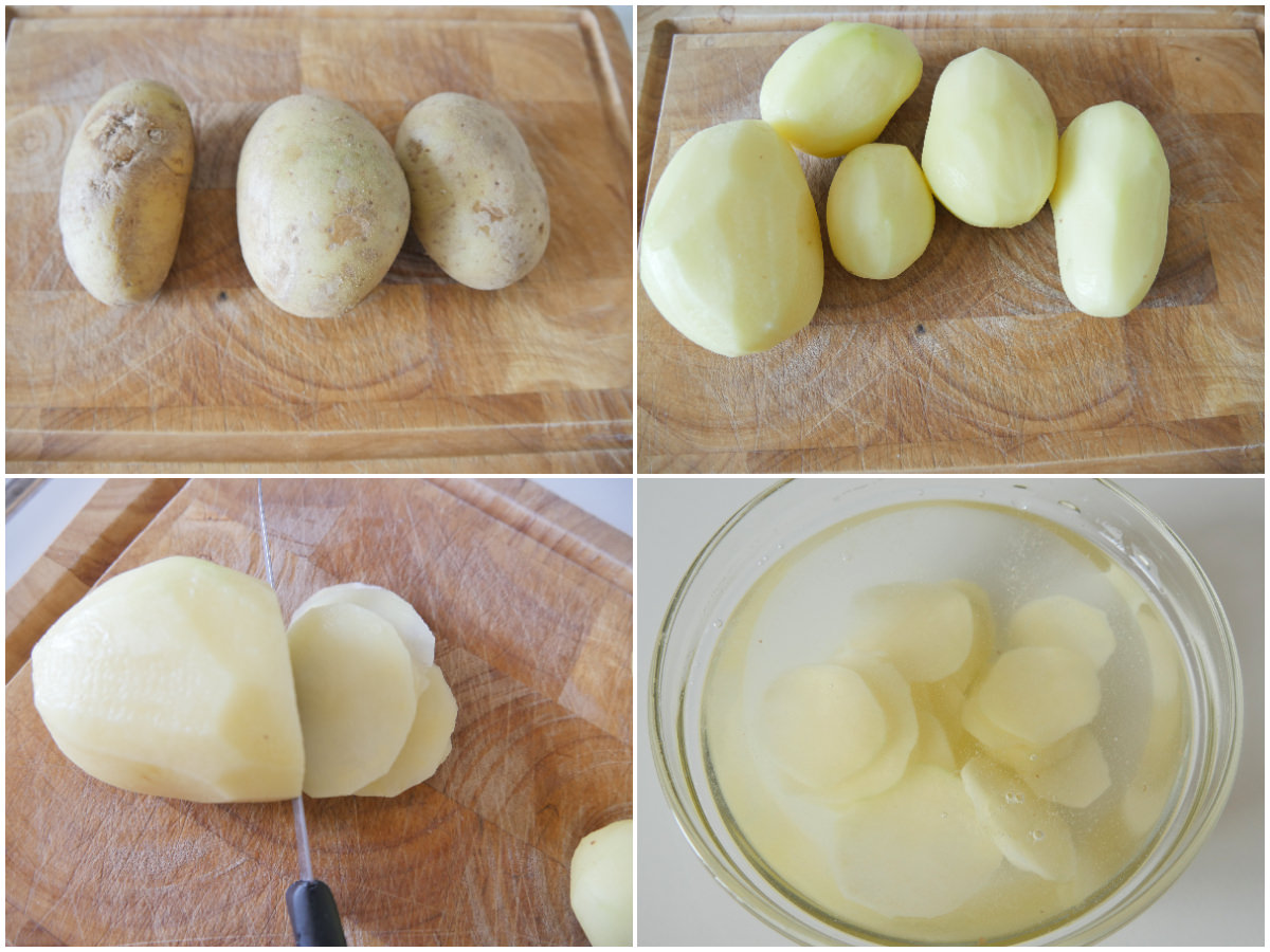 Innanzitutto pelate le patate, lavatele, tagliatele a fettine sottili circa 2 mm (con una mandolina o un coltello affilato) e lasciatele riposare in una ciotola, ben coperte di acqua fredda, per almeno 30 minuti, in modo che perdano un po' di amido e risultino più croccantine.