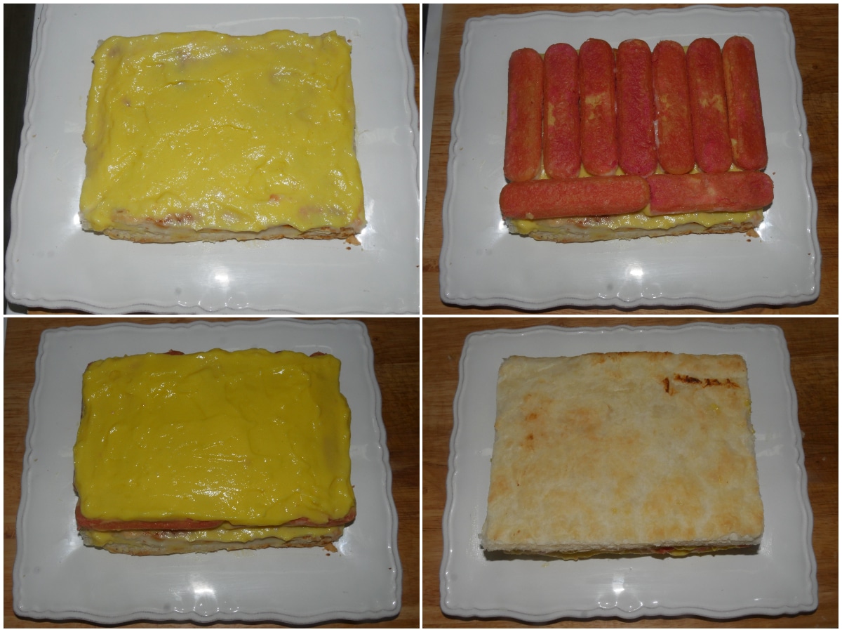 Assemblate la torta: disponete una sfoglia su un piatto da portata, copritela con metà della crema e create poi uno strato di savoiardi bagnati di alchermes.