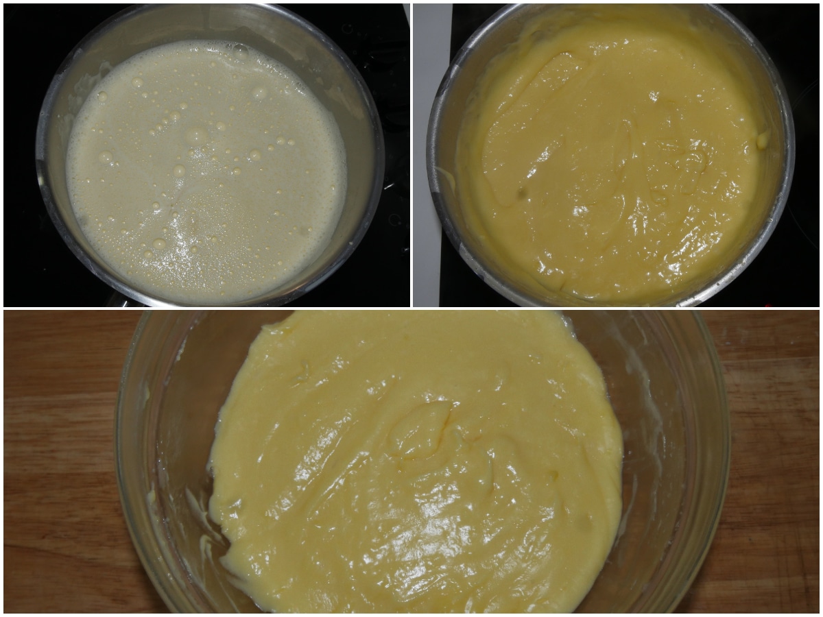 Ich habe die Milch mit der angerührten Stärke angedickt. Etwas abkühlen lassen und dann zu der Eimasse gegeben. Sonst gibt es keine Creme.