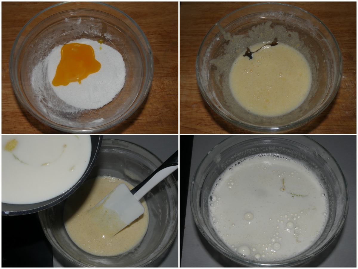 Lasciate raffreddare le sfoglie, e nel frattempo preparate la crema: mescolate zucchero e tuorli, quindi incorporate la vaniglia, poi la farina e infine il latte, che avrete scaldato con la buccia di limone.