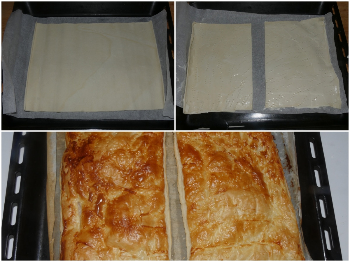 Innanzitutto preparate le sfoglie: disponete la pasta sfoglia sulla teglia rivestita di carta forno, dividetela a metà e allontanate le due parti tra di loro (in modo che non si uniscano di nuovo in cottura).