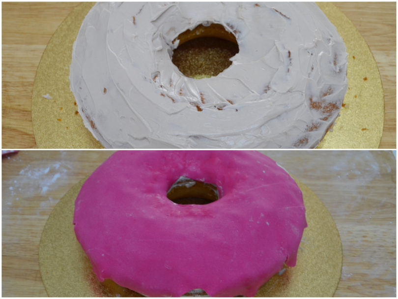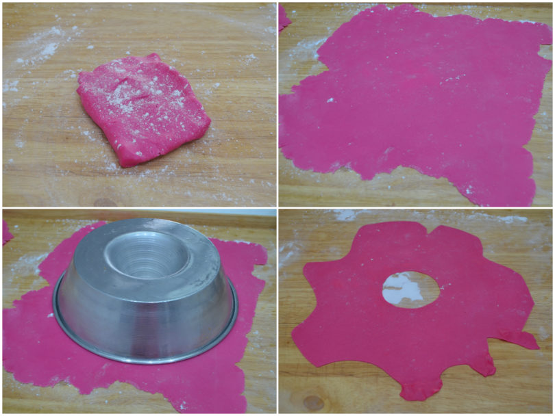 Stendete la pasta di zucchero in una sfoglia sottile e, aiutandovi con lo stampo capovolto per ottenere la dimensione giusta, ricavate una forma irregolare simulando i goccioloni di glassa di una classica donut.