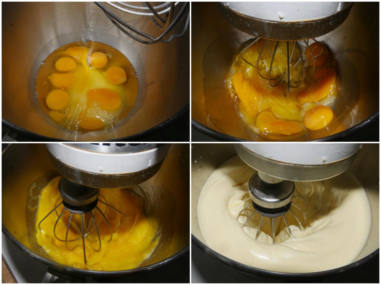 Innanzitutto preparate il pan di Spagna al cacao: montate le uova con lo zucchero per almeno 10 minuti, dovranno triplicare di volume.